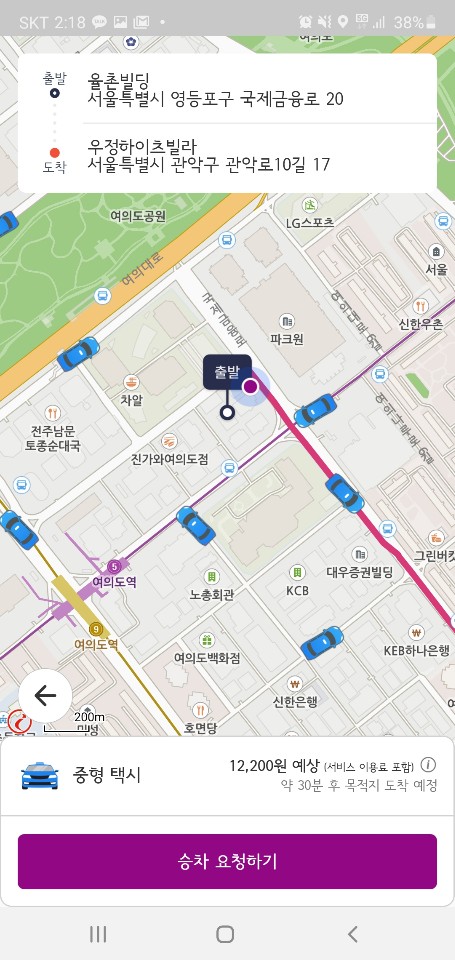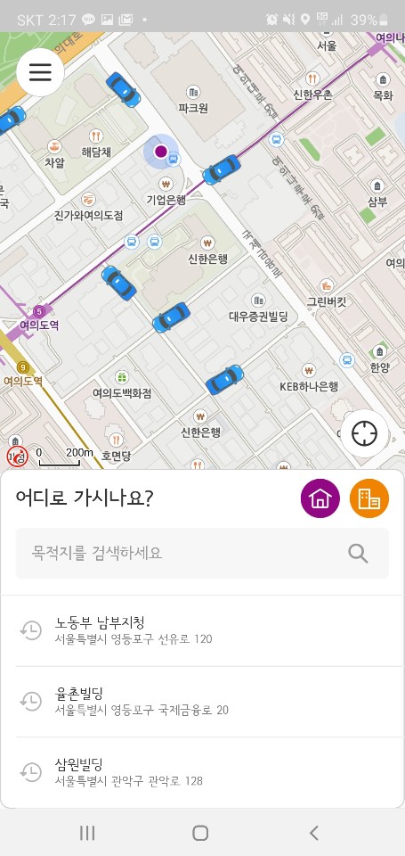 온다택시 어플을 실행하시면 여러분 주변에 운행중이 온다택시들이 그림처럼 표시가 됩니다. 우선 목적지 입력을 합니다. 그 다음 출발지 입력 후 승차 요청하기 누르시면 면 끝! 잉~? 뭐가 이렇게 쉬워? 정말 쉽죠!