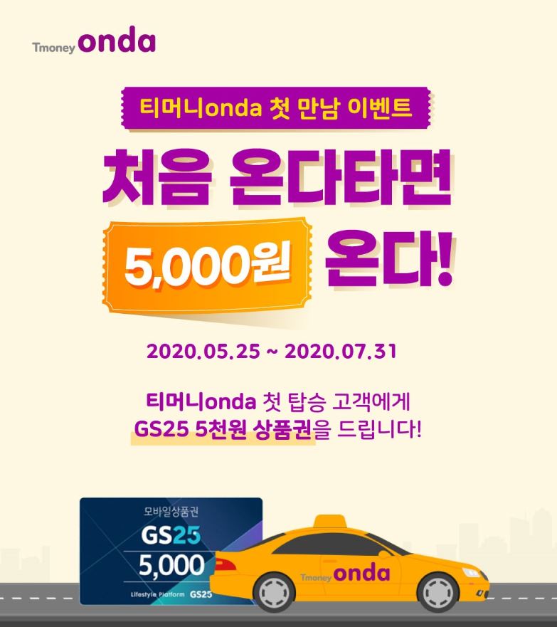 온다택시 처음 이용하시는 고객들에게는 목적지까지 도착 후 하차하시면 GS25 편의점에서 사용할 수 있는 5천원 상품권을 사용하고 계시는 스마트폰으로 보내줍니다.