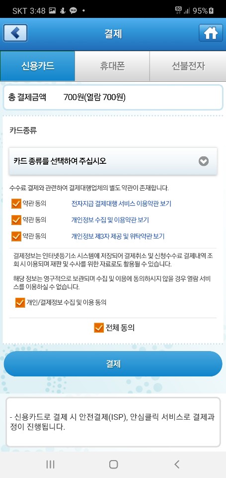 ※결제방법 : 신용카드결제, 금융기관 계좌이체, 선불전자지급수단, 휴대폰 결제 중 선택할 수 있습니다.
