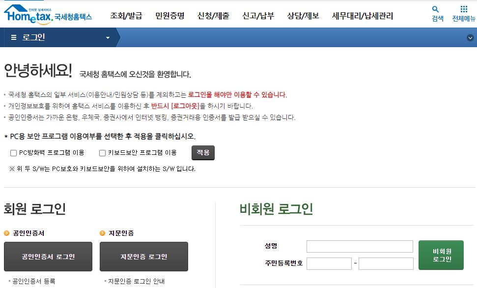 1. 포털사이트 검색창에 "홈택스" 검색 후 나오는 링크를 클릭하면 "국세청 홈택스" 사이트로 이동하여 회원, 비회원 로그인 방법을 선택합니다. (공인인증서 필수)