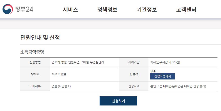 1. 포털사이트 검색창에 "소득금액 증명" 검색 후 나오는 링크를 클릭하면 "정부24" 민원 제공 사이트로 이동하여 "신청하기"를 클릭합니다. (회원가입 또는 비회원으로도 가능하니 참고하기 바랍니다.)