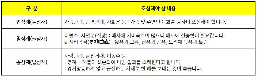 위와 같이 2021년 삼재띠에 해당되는 세가지 띠와 구분별 조심해야 할 부분에 대해 간략히 정리했습니다.