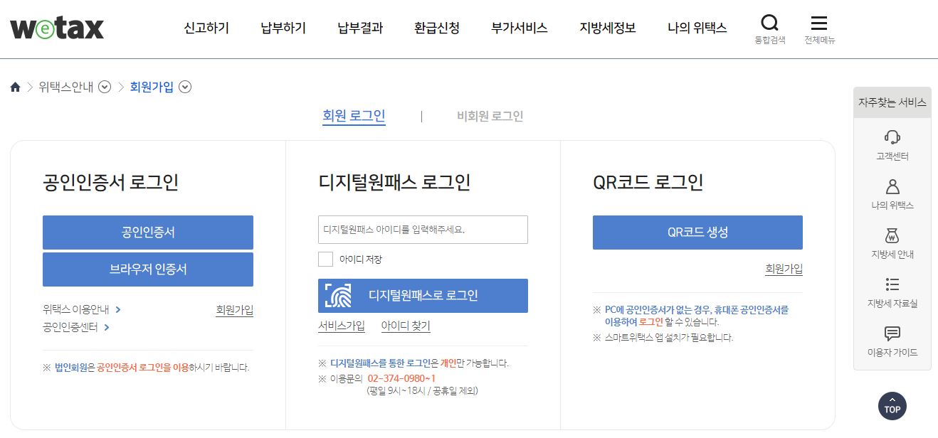 1. 포털사이트 검색창에 "위택스" 검색 후 사이트로 이동하여 "정부24"와 동일하게 회원 또는 비회원으로 진행가능합니다.