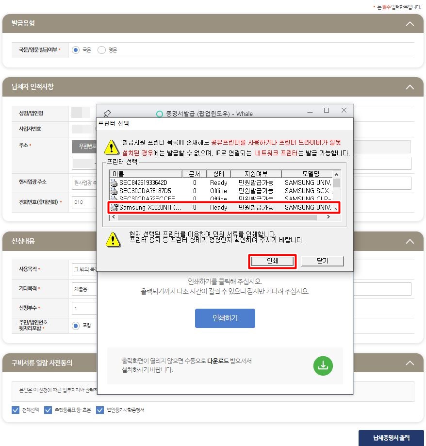 ※ 공인인증서, PC(컴퓨터 또는 노트북), 프린터, 인터넷 환경이 수반되어야 합니다. 스마트폰인 모바일 환경에서 미리보기만 가능하며 출력은 PC에서 진행하여야 합니다.