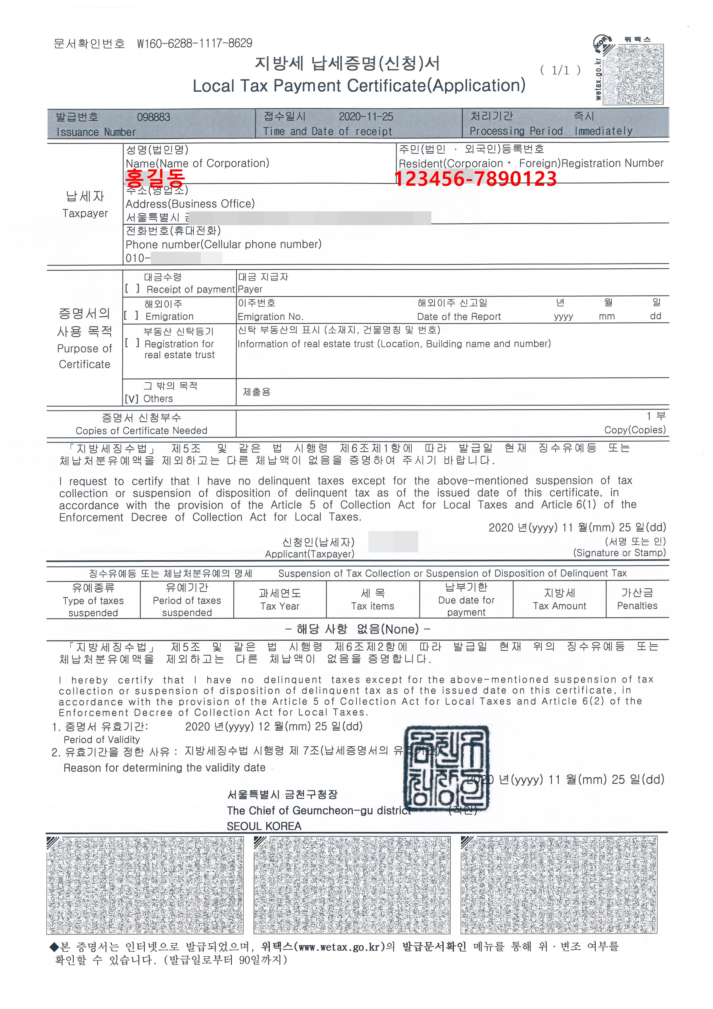 정확한 명칭은 지방세납세증명서지만, 시와 군(자동차세, 지방소득세, 주민세 등), 도(등록면허세, 취득세, 지방소비세, 레저세 등)에 내는 지방세금에 대해 체납 없이 완납하였는지 확인하는 서류로 지방세완납증명서로 많이 불리고 있습니다.