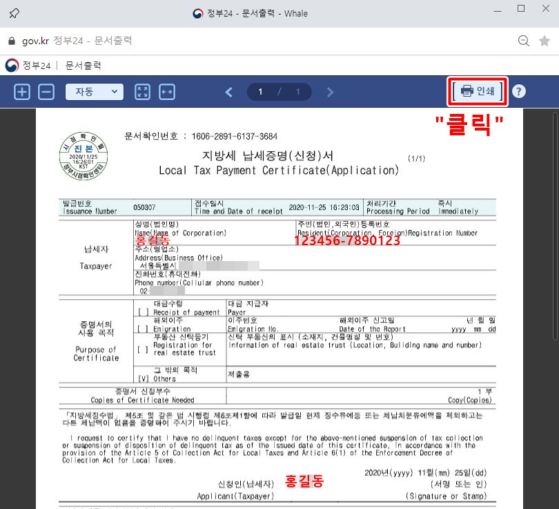 4. "문서출력" 부분 클릭하여 상기와 같이 지방세 납세증명서 인쇄화면이 나오고, "인쇄" 부분을 클릭하면 지방세완납증명서 인터넷발급이 완료됩니다.