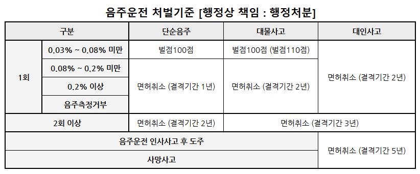 음주운전으로 적발되면 운전자는 민사적 책임, 5년 이하의 징역 또는 2000만원 이하의 벌금과 같은 형사적 책임, 운전면허 정지나 취소와 같은 행정책임을 모두 지게 됩니다.