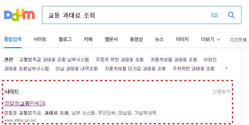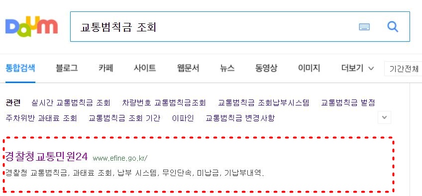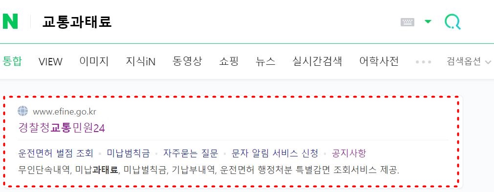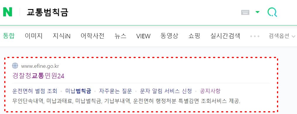 반드시 고지서를 수령하지 않았더라도 혹시 위반사실이 있는지 조회해보는 것도 좋습니다. 우선 검색 포털 사이트를 통해 "교통범칙금", "교통과태료", "교통범칙금 조회", "교통 과태료 조회" 검색어로 조회하게 되면 위와 같이 경찰청 교통민원24 이파인 [https://www.efine.go.kr/]을 찾아볼 수 있습니다.