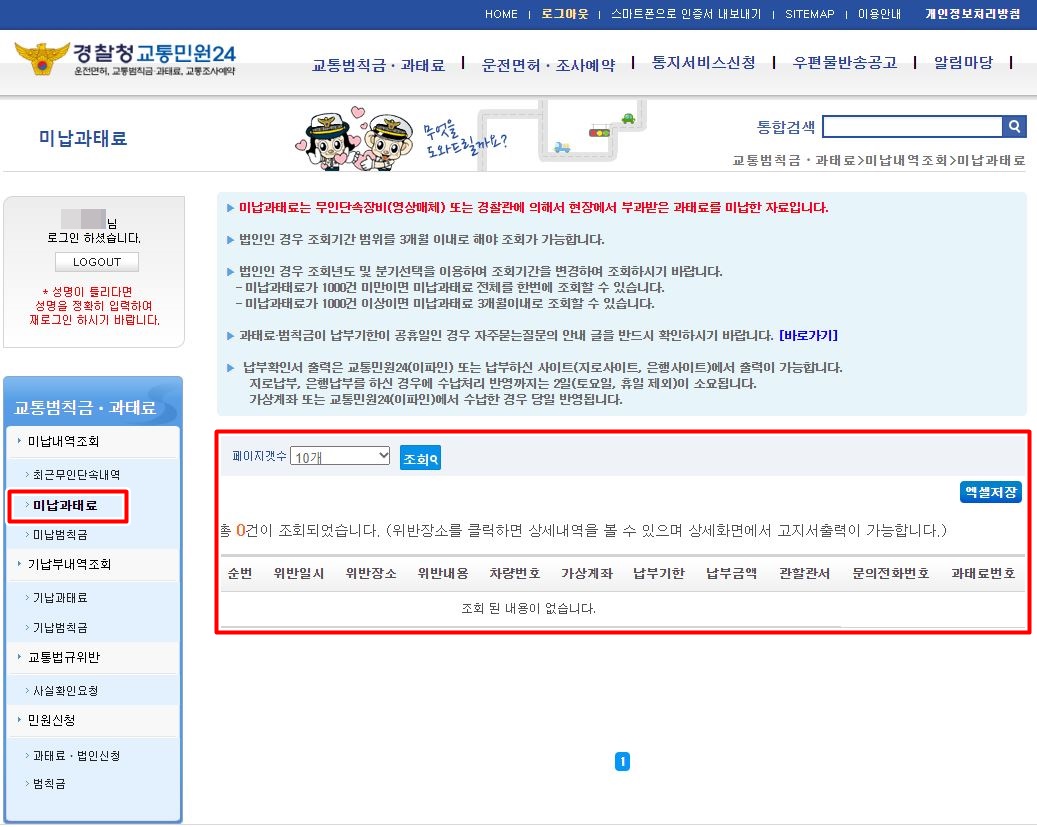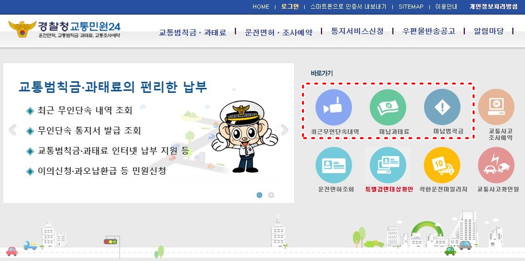 3. 로그인 후 "최근무인단속내역" 또는 "미납과태료"를 클릭합니다.