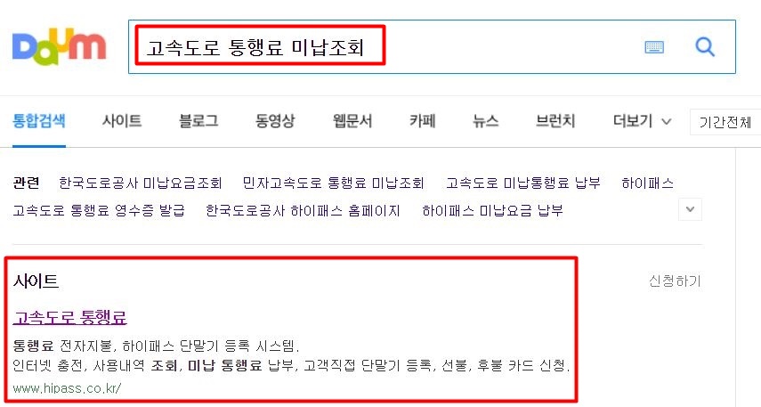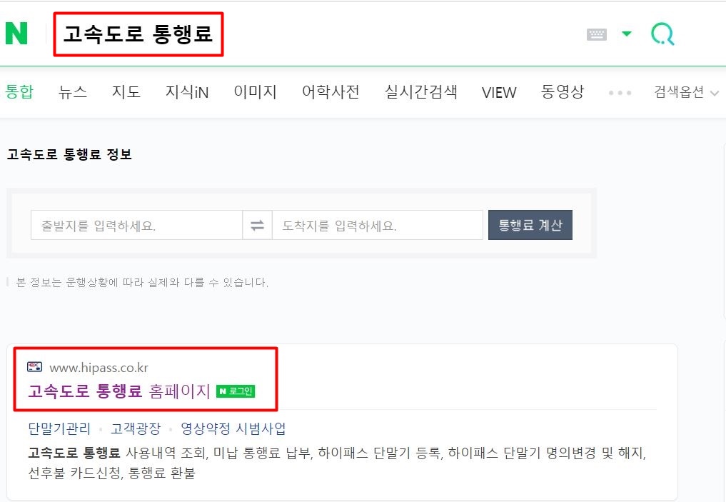 차량 운행을 마치고, 인터넷 포털사이트에서 "고속도로 통행료", "고속도로 통행료 미납조회" "하이패스" 등으로 검색합니다.