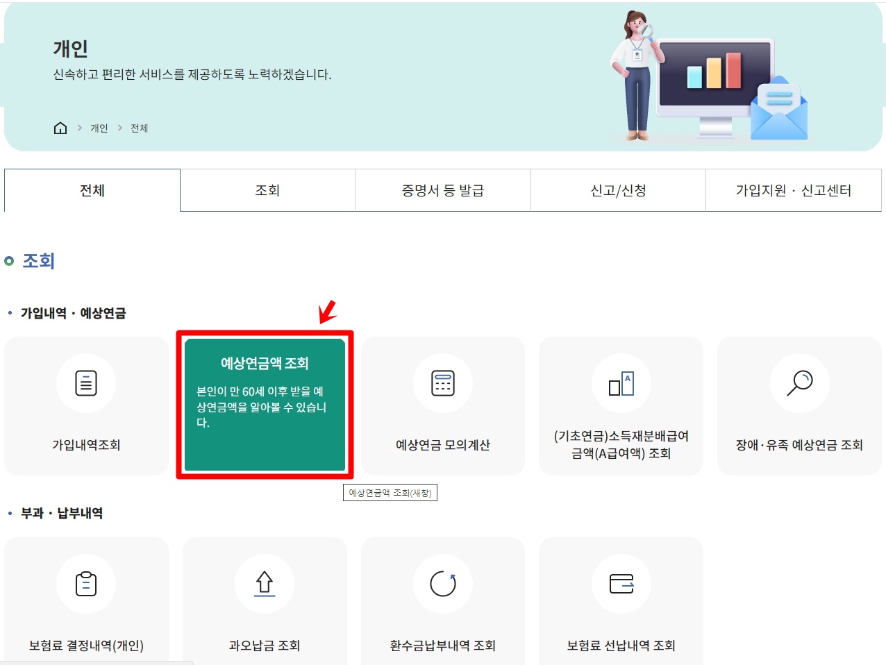 2. 전체 > 예상연금액 조회 클릭합니다.