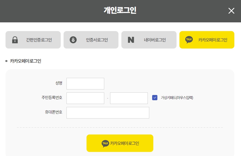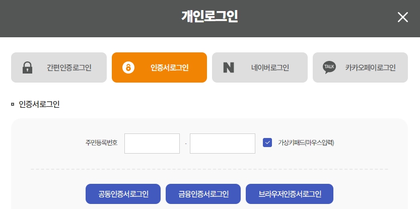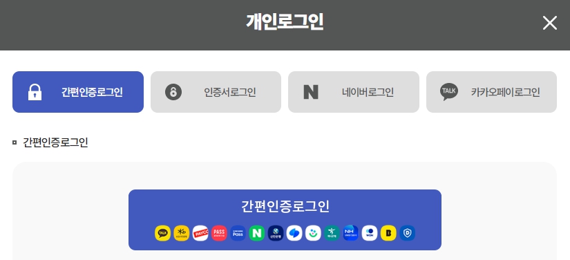 ※ 간편인증, 인증서, 네이버로그인, 카카오페이로그인 중 선택할 수 있습니다.