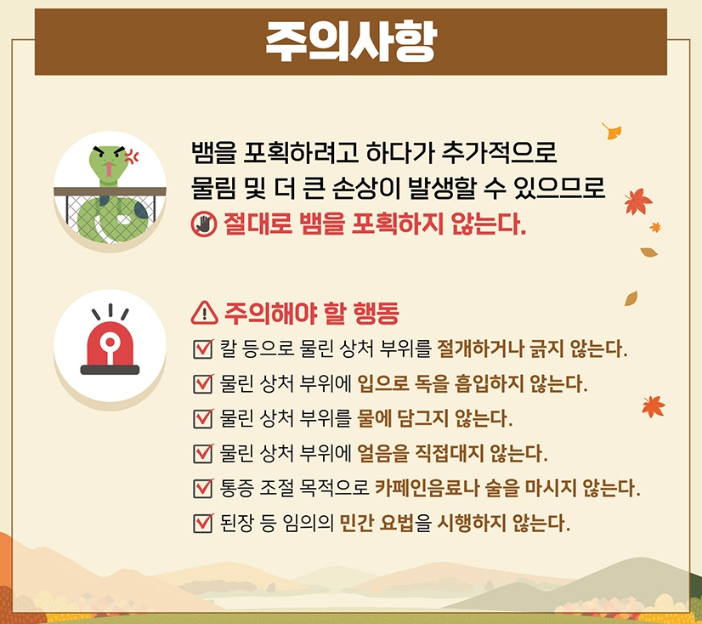 - 독이 퍼지는 것을 막겠다고 상처부위를 강하게 압박하거나 꽉 묶으면 안 됩니다. 이로 인해 혈액순환이 되지 않아 피부괴사가 진행될 수 있습니다.