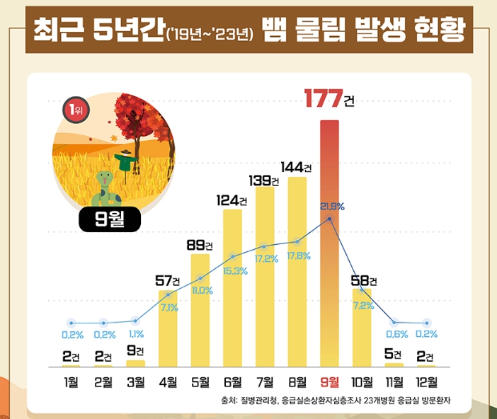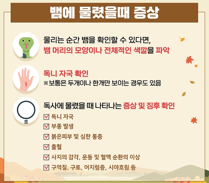 가을철에는 야외활동이 많아지기 때문에 호수나 저수지, 산, 동굴, 강 등에서 뱀을 마주하게 될 가능성도 높아집니다. 특히 가을철에 뱀 물림 사고가 가장 많이 발생하기 때문에 각별한 주의가 필요하겠습니다. 뱀을 만나게 될 경우 갑작스럽게 움직이지 말고 서서히 물러나는 것이 중요합니다. 갑작스러운 움직임은 뱀을 자극할 수 있기 때문입니다. 참고로 독사는 성체보다 어린 개체가 훨씬 위험합니다. 오히려 어린 독사는 독의 양을 잘 조절하지 못하기 때문에 물렸을 경우 더 많은 양의 독이 주입될 수 있고, 물린 자국도 작아 물렸는지 몰랐다가 치료 시기를 놓쳐 사망에 이를 수 있습니다. 뱀에 대한 올바른 정보와 뱀에 물렸을 때 응급처치 방법을 숙지하면 더 건강하고 즐거운 야외활동을 할 수 있을 것입니다.